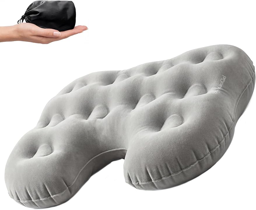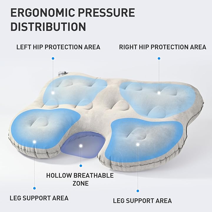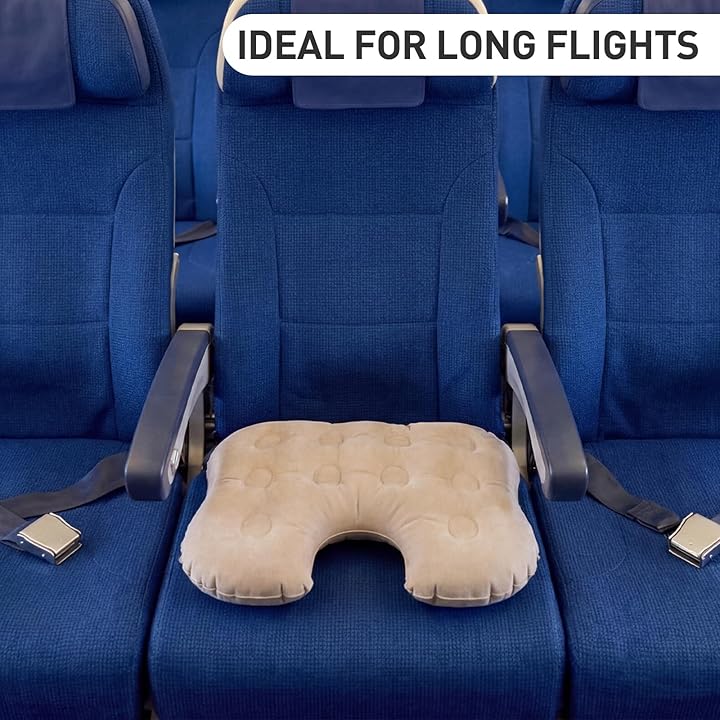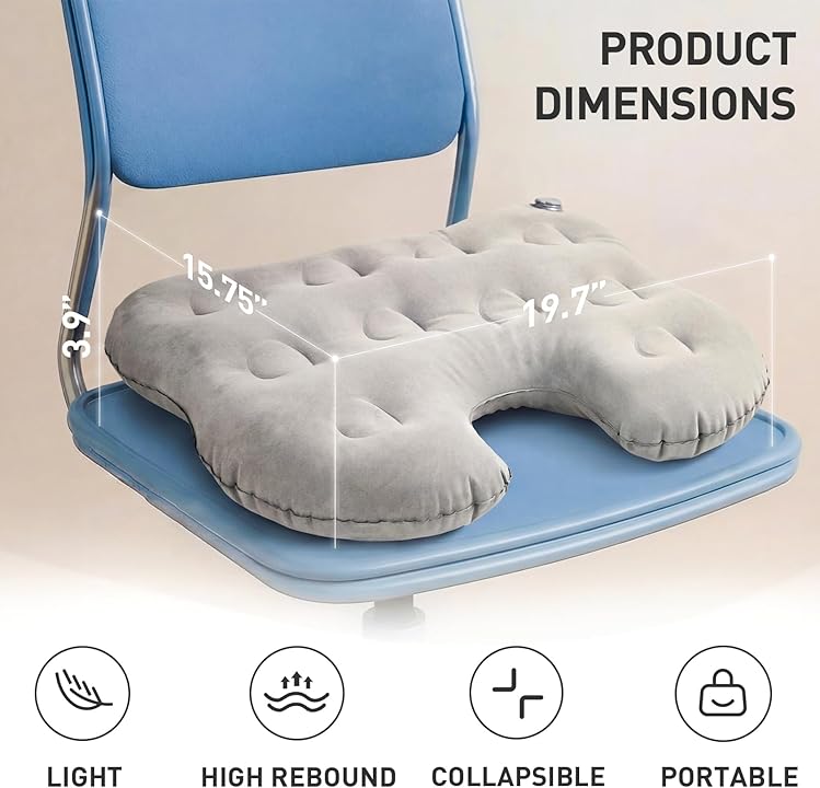 - EXTRA LARGE & THICK FOR COMFORT – Generous 19.7″ x 15.7″ x 2.8″ (50 × 40 × 7 cm) inflated size provides broader coverage and thicker 7cm padding than most travel cushions, evenly distributing weight to relieve tailbone, hip, sciatica, and lower back pressure—ideal for long flights, stadium bleachers, hard office chairs, or camping